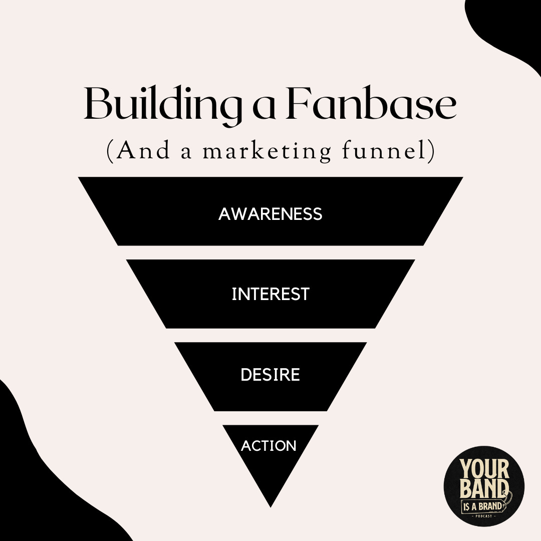 In order to build a fanbase you will need to develop a process for turning listeners into fans. The best way to visualize this process is with a marketing funnel. Building a fanbase starts with the 3 elements: